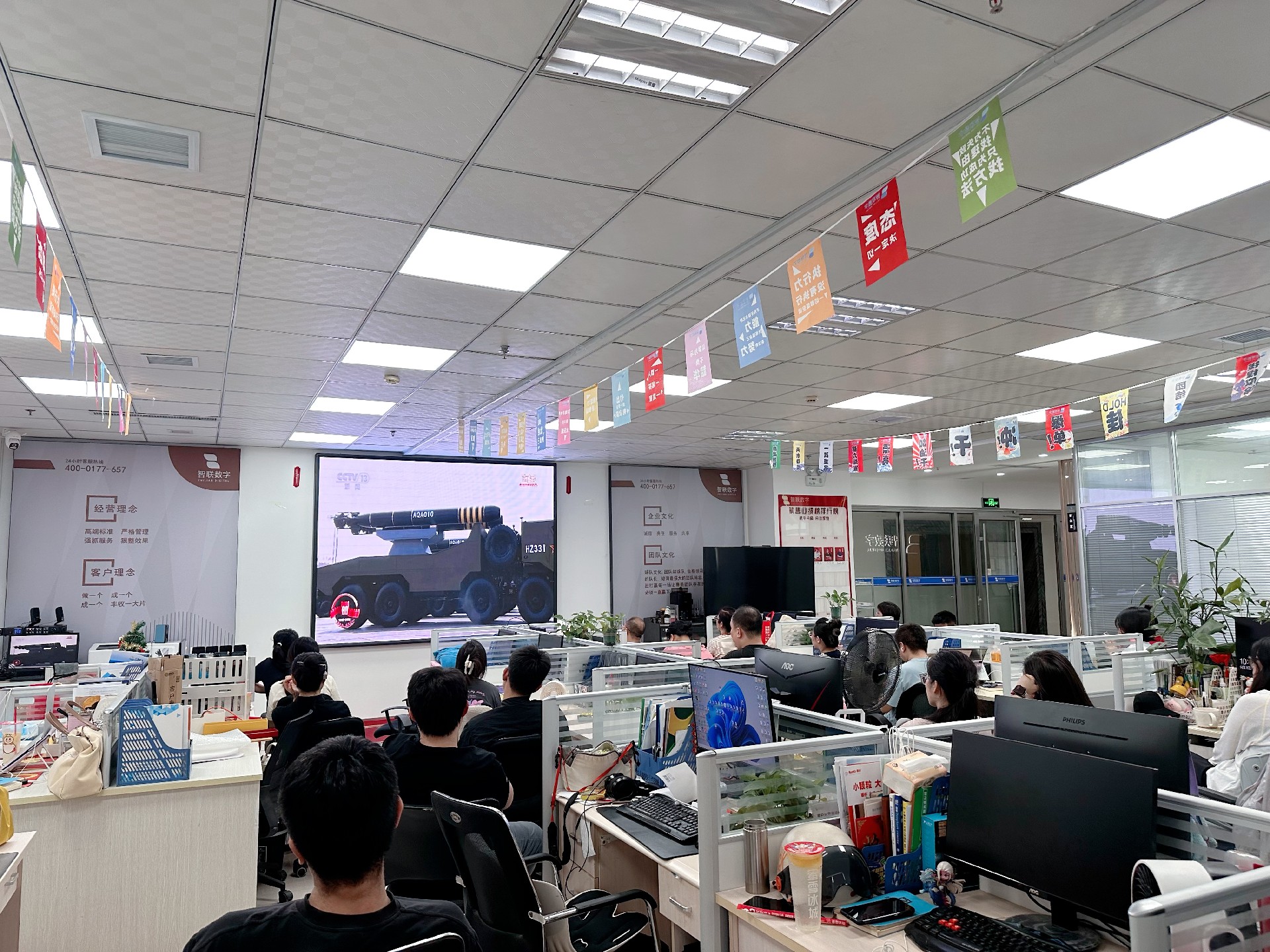 阅兵仪式开始,智联数字全体员工准时观看在线直播,大家目光追随总书记习近平乘坐的红旗牌检阅车,经过金水桥,驶上长安街。仿佛大家也亲临现场,共同参与此次阅兵,大家神情专注地盯着大屏幕!跟随现场的掌声一起鼓掌,共同见证国家强大、民族复兴的辉煌时刻!